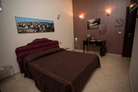 La stanza posta al secondo piano dell’Hotel si presenta sobria, arredata in stile moderno, composta da un letto matrimoniale. Le pareti sono rivestite di carta da parati a unica tinta, il cui colore prevalente è il rosso bordeaux. Le tende sono a doppio strato. Gli infissi sono a taglio termico e con vetro camera che garantiscono totale insonorizzazione dai rumori esterni. La stanza è dotata di balcone autonomo che si affaccia sull’agorà del paese. Misura mq.14,00, ed è dotata di armadio, frigo bar, tv, impianto di condizionamento, cassaforte, telefono, scrittoio, due comodini, due sedie e un porta trolley. Nella stanza è attivo il sistema wi-fi free ad alta velocità. Il bagno in camera misura mq. 3,20, ed è fornito di doccia, bidet e asciugacapelli. Il bagno è dotato di finestra, anch’essa insonorizzata, che si affaccia sul corso principale del paese e garantisce luce ed aria naturale e non forzata.