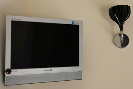 La stanza posta al secondo piano dell’Hotel si presenta sobria, arredata in stile moderno, composta da un letto matrimoniale. Le pareti sono rivestite di carta da parati a unica tinta, il cui colore prevalente è il rosso bordeaux. Le tende sono a doppio strato.